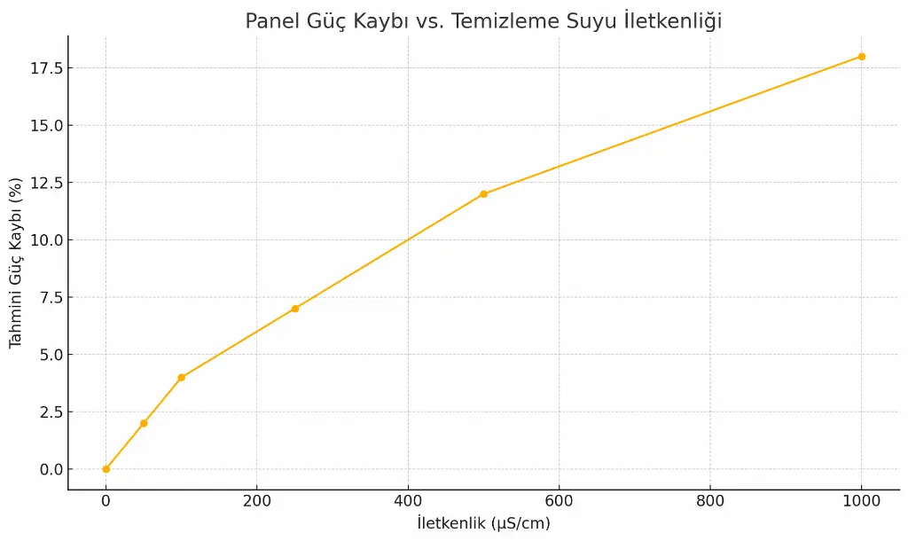 Yukarıdaki grafik, panel yüzeyine bırakılan suyun iletkenliği arttıkça tahmini güç kaybının lineer şekilde yükseldiğini gösterir. 1000 µS/cm seviyesinde kayıp %18’e ulaşırken, Solarfresh standardı olan < 30 µS/cm’de bu kayıp ihmal edilebilir düzeydedir.